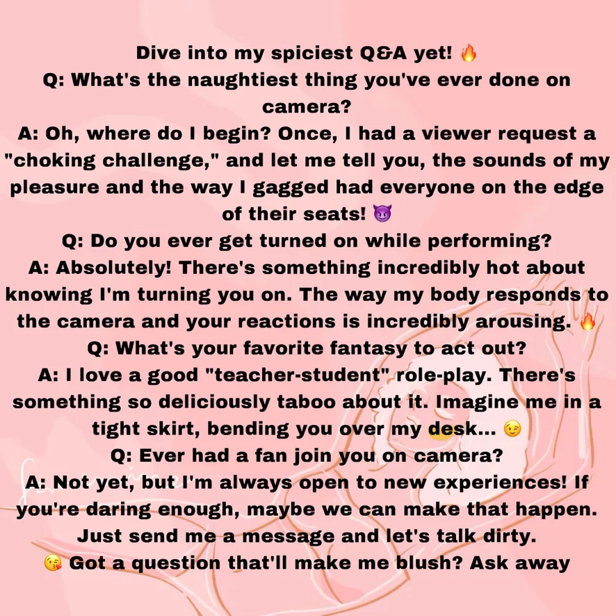 🔥 Ready for some heat? My latest Q&A is full of naughty secrets! 😈 From steamy challenges that left me breathless to fantasies that push all the boundaries, I’m spilling it all. Ever wondered what turns me on on camera or my favourite to do role-plays? 😉 Dive in, ask me your boldest questions, and maybe I’ll answer them live… if you’re brave enough. 😘🔥