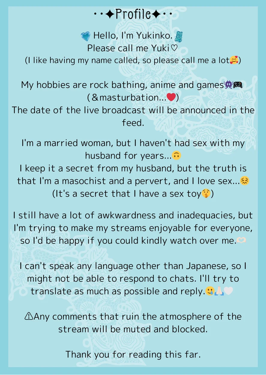 ●ファンクラブ特典の内容は予告なく変更になる場合がございますので、予めご了承ください。 ●ファンクラブ会員様が偉いわけではありませんので、他リスナー様へのマナーもお守りください。 ●私の配信について、こちらの求めていない過度なアドバイスや押し付けはやめてください。 ●暴言や配信の雰囲気を乱すような発言、リアルを求める方はFC会員様であっても報告・ミュート・ブロックさせていただきます。 また誹謗中傷や個人情報・プライベートを聞き出す行為、荒らしや不快なコメントはおやめください。 ●ファンクラブ限定コンテンツ内の動画や画像の転載・販売行為 は禁止です。 発見した場合は運営に報告の上、法的措置を取らせていただきます。 ⚠️私の許可なくライブ配信映像のスクリーンショットを含む写真撮影、録画行為は固くお断りいたします。動画や画像を無断転載、販売等、流出させた場合は、肖像権・著作権の侵害として差止請求と損害賠償請求並びに刑事告訴を求める手続きをさせていただきます⚠️ ●ゆきの配信について、何かご意見がある場合は私に直接PMしてください。 勝手な思い込みや憶測で他リスナーさんに対して攻撃的・挑発的な発言をすることはおやめください。守っていただけない場合は妨害行為とみなし、運営に報告の上ブロックさせていただきます。 ●オンライン中(緑ランプがついている状態)であってもすぐにPM返信ができるとは限りませんのでどうかご理解ください。 運営さんへの問い合わせや各種設定変更などで長時間オンライン状態になっていることもございます。 また、私にも仕事やプライベートがあるため、PMの返信は遅れることがあります。 オンライン中なのにPMの返信が遅いとおっしゃる方がたまにいらっしゃいますが、この点ご理解いただけますようお願いいたします。